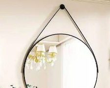 XRAMFY 24 in. W x 24 in. H Round Mirror with Hanging Leather Strap Aluminum Frame Black Wall Mirror